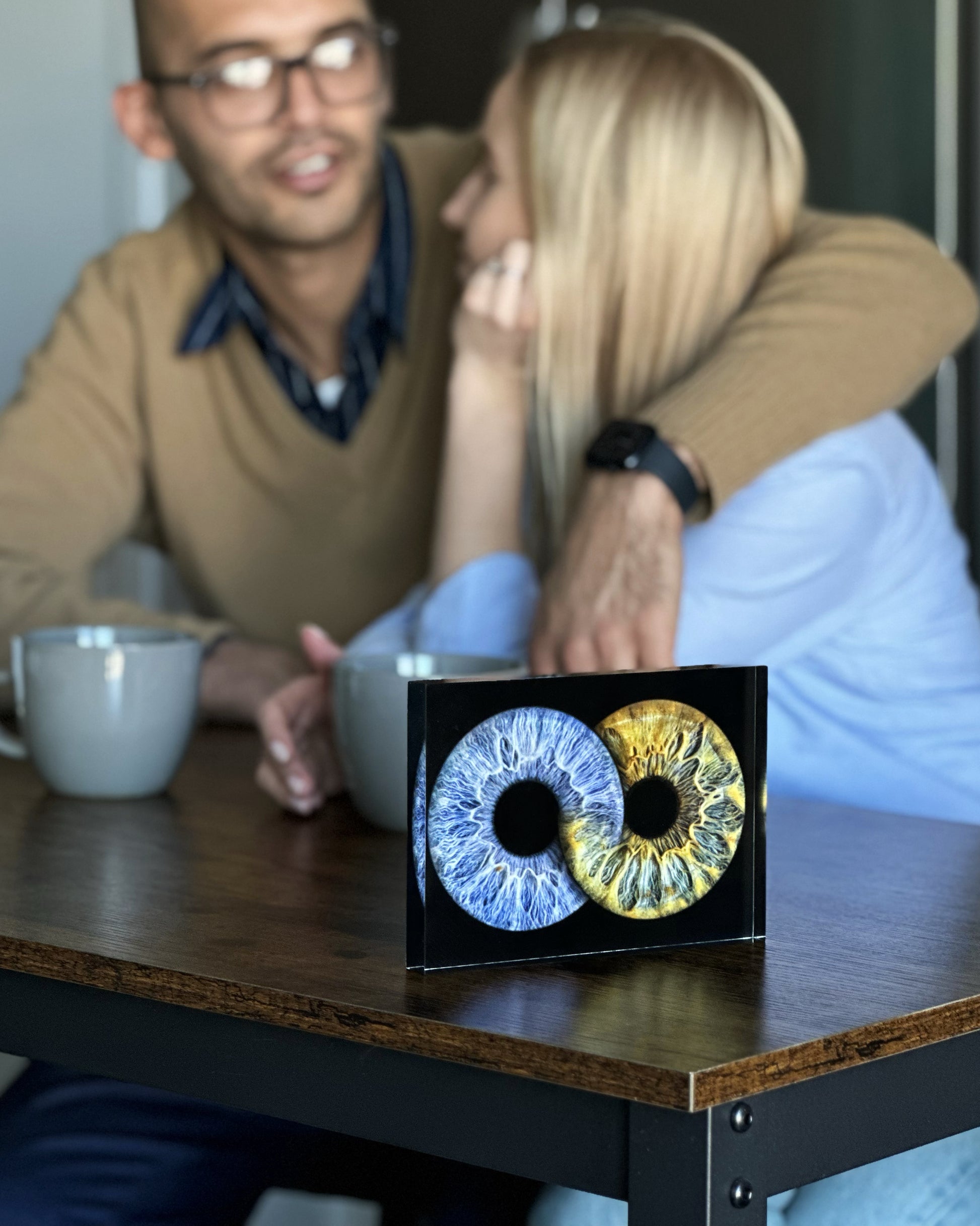Stunning dual-eye photo designs collection. Snap a few pictures of your eyes with your phone, and we’ll do the rest. Our experts will edit your personalized Iris Couple Design. Each piece showcases your unique eyes, making it a one-of-a-kind gift and a great conversation starter.